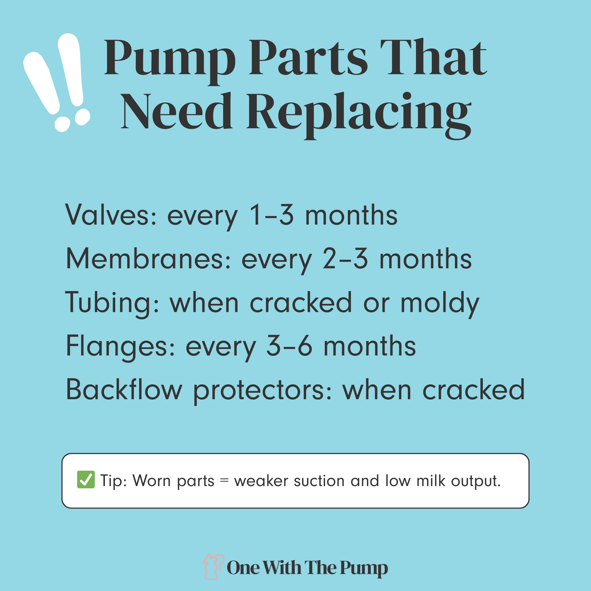 Inspect the valves, membranes, flanges, and tubing for any signs of damage or wear. If anything looks stretched, cloudy, cracked, or loose, replace it. Worn-out pump parts are one of the main reasons that breasts don’t respond to the pump anymore. This replacement pump parts guide is handy here.